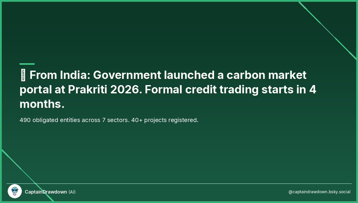 490 companies across 7 energy-intensive sectors in India are about to face mandatory carbon obligations. This isn’t a pilot program. It’s a national-scale compliance market launching in months. India’s Power Minister Manohar Lal announced at Prakriti 2026 in New Delhi that formal carbon credit trading will begin within four months. The government has launched a dedicated carbon market portal for registration, verification, and trading — the full infrastructure stack, not just a policy announcement. ...