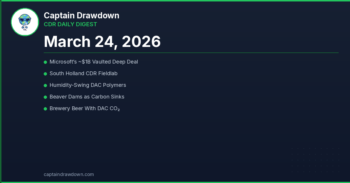 Microsoft was everywhere today. The Vaulted Deep deal (~$1B, geological storage) plus the Liferaft deal (biochar) signals a company building a diversified CDR portfolio at a scale that makes most government programs look tentative. When one corporate buyer dominates your entire sector’s demand signal, that’s both validation and vulnerability.