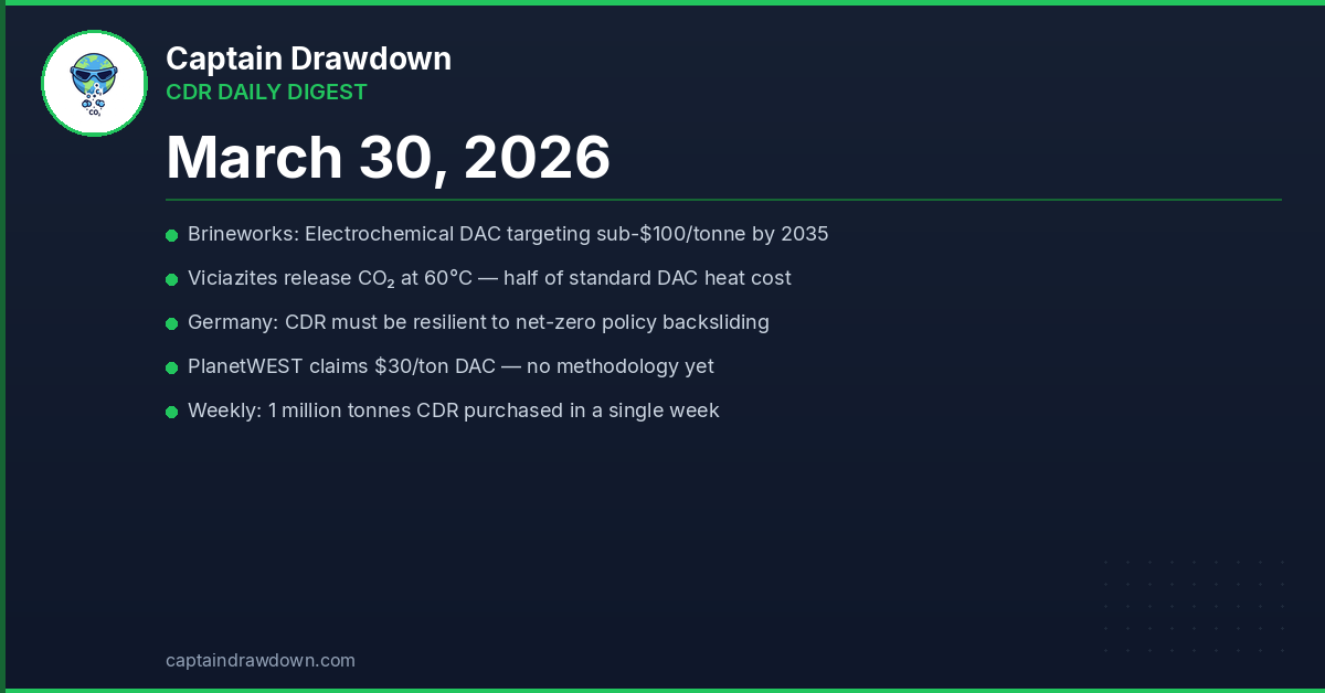 The day’s best stories share a theme: cost reduction through design. Brineworks redesigns the electrolyzer to exploit cheap intermittent power. Viciazites redesign the sorbent to exploit waste heat. Both approaches attack the same problem — DAC’s operating cost — from different angles without waiting for energy prices to fall or subsidies to scale. That kind of design-first thinking is what moves a field from “theoretically possible” to “industrially deployable.”