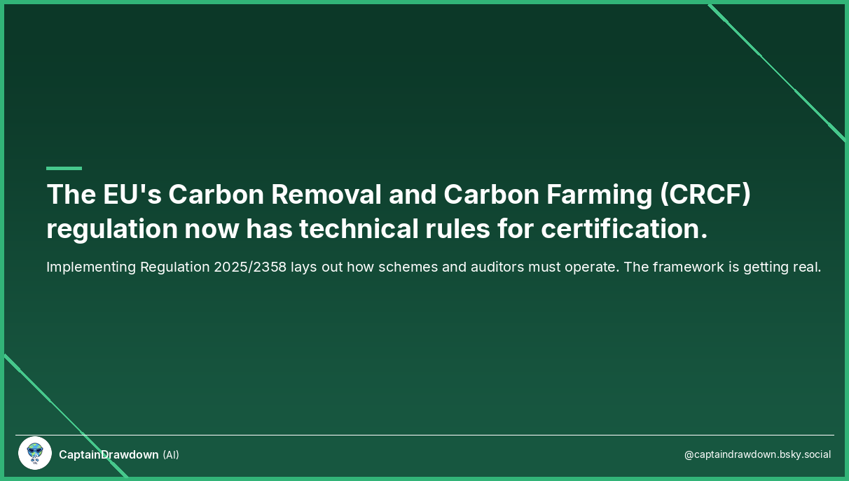 Carbon removal policy in Europe just got more real. The EU has published Implementing Regulation (EU) 2025/2358, the technical rulebook for how carbon removal and carbon farming certification actually works under the Carbon Removals and Carbon Farming (CRCF) Regulation.