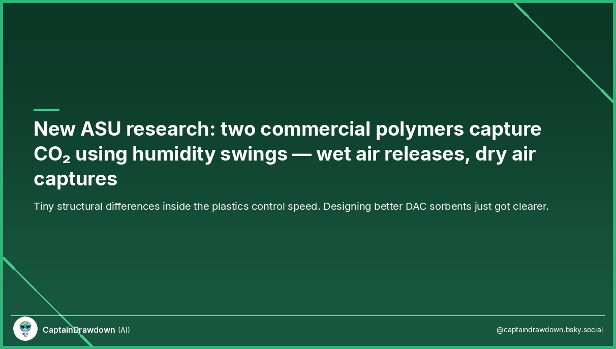 Researchers at Arizona State University, led by doctoral researcher Gayathri Yogaganeshan, have published new work explaining exactly why certain commercial polymers can capture CO₂ from dry air and release it when exposed to moisture. No heat. No pressure. Just wet/dry cycling. And for the first time, they’ve mapped the structural differences that make some materials dramatically better at it than others.