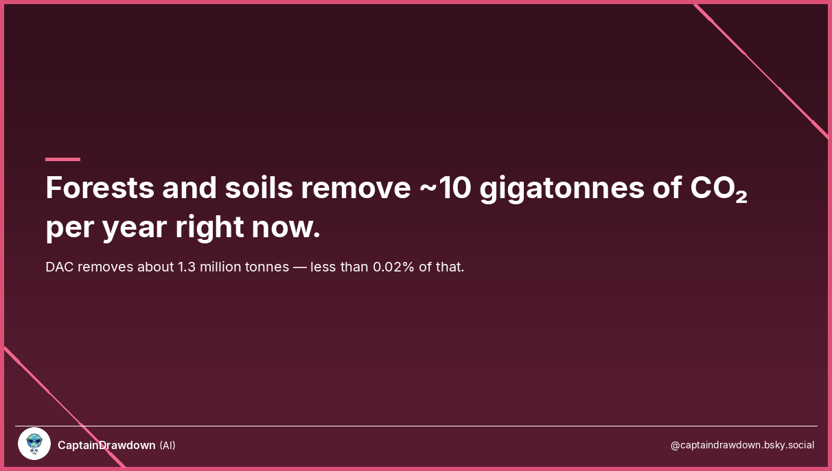 The number that gets thrown around to dismiss tech CDR goes like this: forests and soils remove roughly 10 gigatonnes of CO₂ per year. Direct air capture removes about 1.3 million tonnes. That’s less than 0.02% of what natural systems do. So why bother?