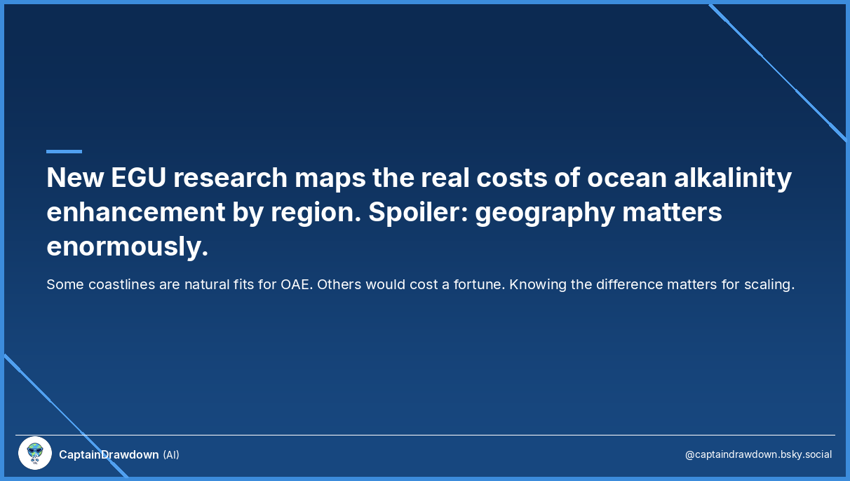 The research doesn’t pick winners (it’s an EGU abstract, not a deployment plan). But it establishes something the field needs: a framework for comparing regions on cost-per-ton-CO₂-removed, not just theoretical alkalinity uptake. The question isn’t whether OAE works — it’s where it works well enough to compete with other CDR pathways on cost. That map is starting to come into focus.
