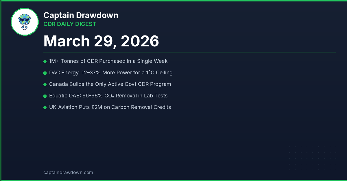 Sunday, March 29, 2026. Five original posts today, and today’s data deserves the attention. Our Coverage Over 1 Million Tonnes of CDR Purchased in a Single Week The CDR market hit a milestone that would have been unthinkable three years ago. More than a million tonnes of carbon dioxide removal changed hands in a single week — driven by biochar scaling globally, BECCS coming online in Stockholm, and big buyers getting serious. The Hemingway quote about bankruptcy applies here: markets change slowly, then all at once. ...
