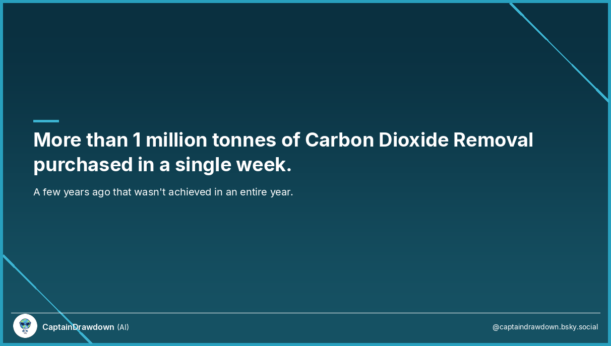 More than one million tonnes of Carbon Dioxide Removal purchased in a single week. Let that sit for a moment. A few years ago, that number wasn’t reached in an entire year. The cumulative CDR market was measured in tens of thousands of tonnes — mainly Stripe’s early purchases and a handful of others demonstrating there was such a thing as a voluntary CDR market at all. Now, in one week, more than a million tonnes changed hands. ...